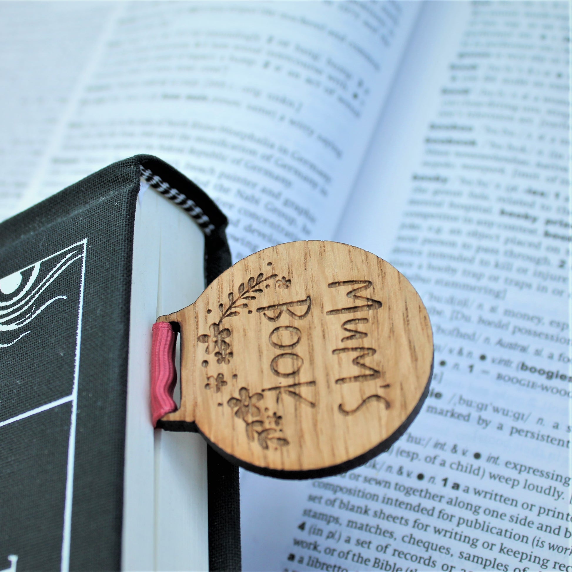 A beautiful wooden bookmark that says: Mum's Book. It is a perfect gift for Mum and her books.