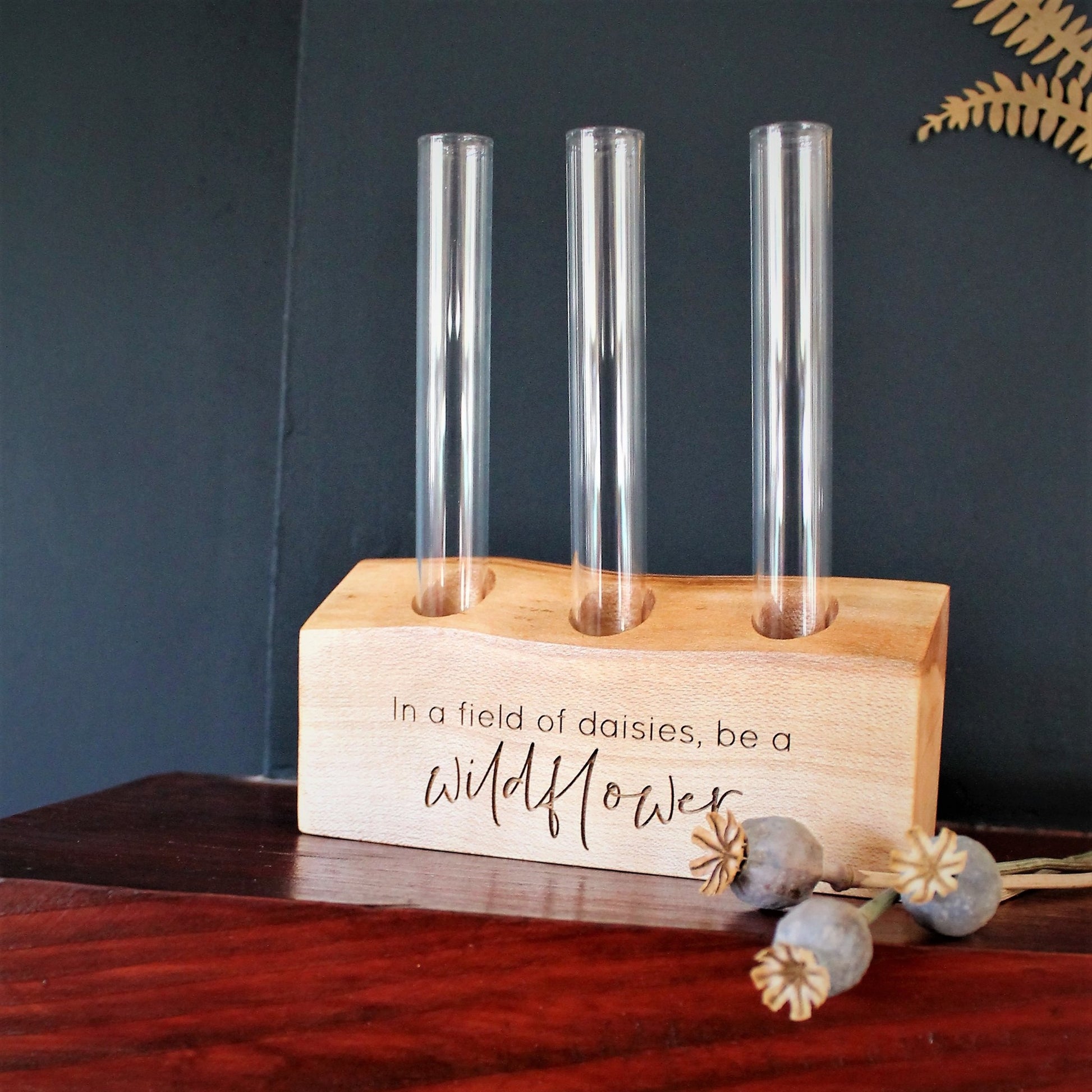 This test tube vase is made from locally sourced Aberdeenshire sycamore, designed, cut, drilled, sanded and engraved in the UK, in our little workshop in the heart of rural Aberdeenshire.